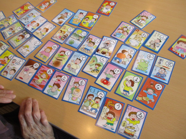 ことわざを使ったいろはカルタをN様と職員と一緒に行い