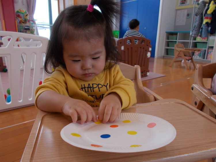 紙皿に、好きな色のシールをペタペタと貼って模様付けです☆