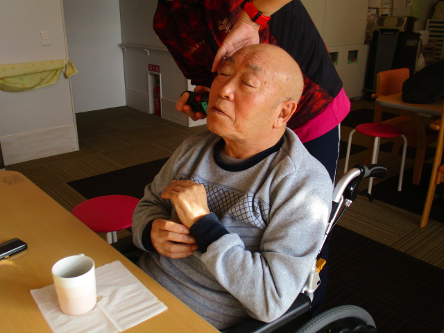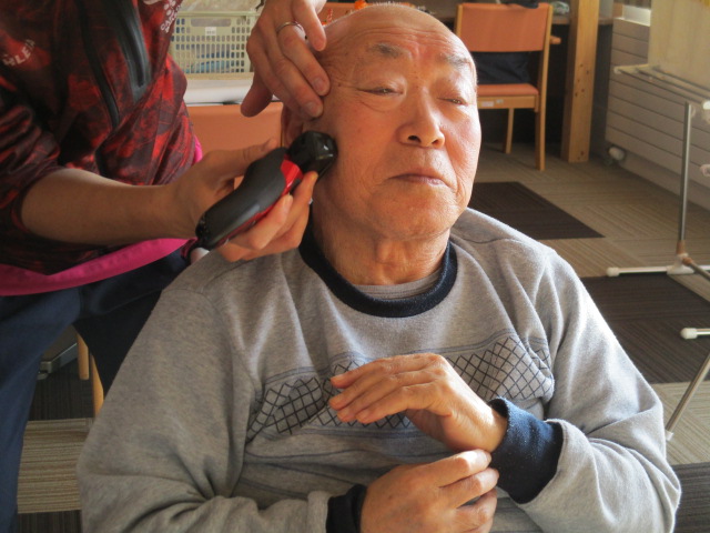 本日の小規模多機能ホームの様子をご紹介致します。本日は朝のモーニングケアの1つ、髭剃り様子です。NリーダーがH介護士へアドバイスをしながら髭剃りを行っています。