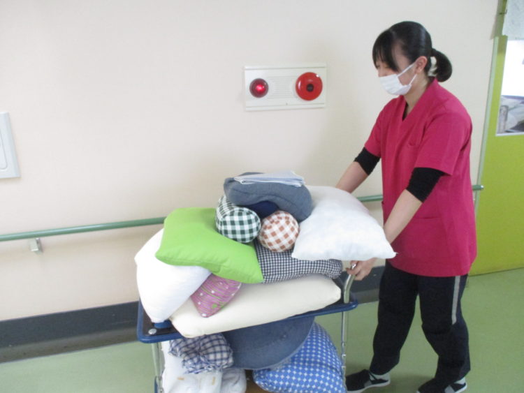 仕分けが終わり、今度はクッションが足りないお客様へ配っていきます。お客様が安定して横を向いていられるように適したクッションを選んでいます。