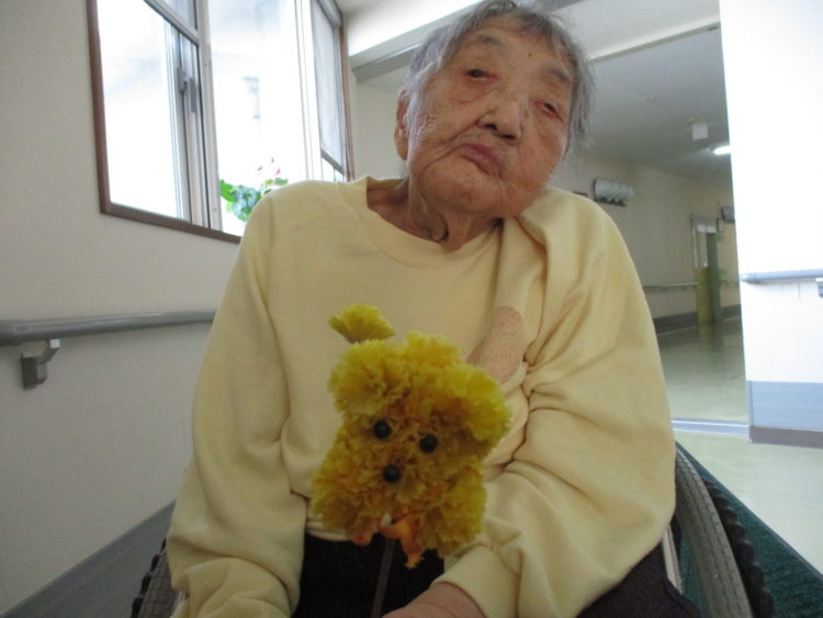 プランターに飾ってある、飾りをみて「これなんだば~」と興味津々にご覧になったり、