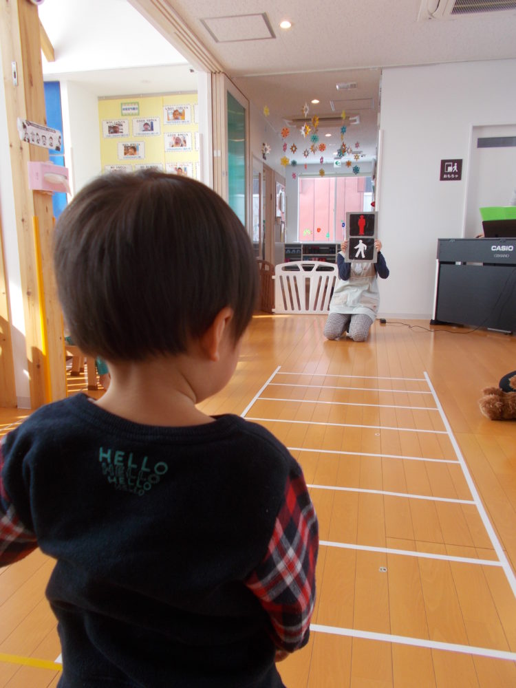 まず紙芝居を見て、飛び出しの危険、信号の正しい見方をお勉強ですヾ(・ω・)ノ