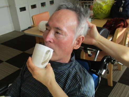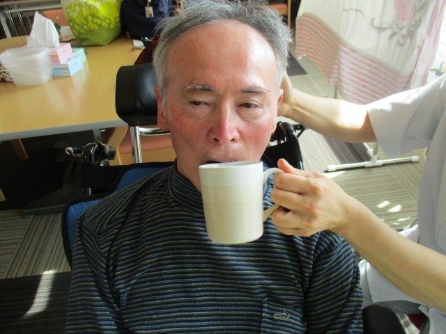 午前ホールに暖かい陽射しが入ってきた頃、S様は甘~いひとときを過ごしていらっしゃいました。T看護師特製のスペシャルコーヒーを召しあがって頂きました。