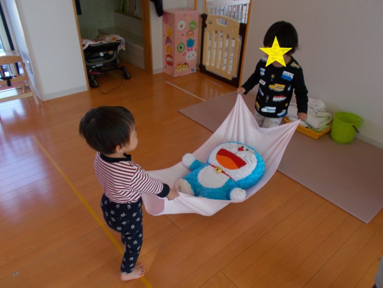 最後はぬいぐるみをバスタオルに乗せて、お友だちと協力して運んでみましたヾ(・ω・)ノ゛