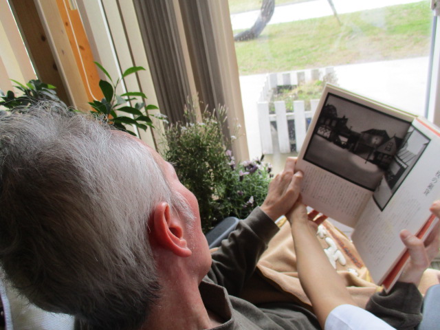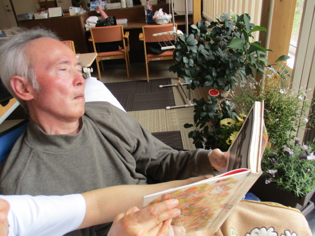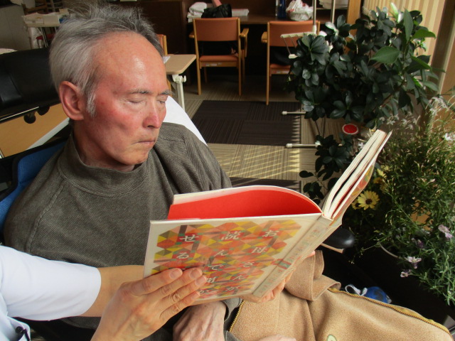 窓辺で眠そうにしておりましたが、上肢屈伸運動の後でしっかり両手で本を持っていただきました。