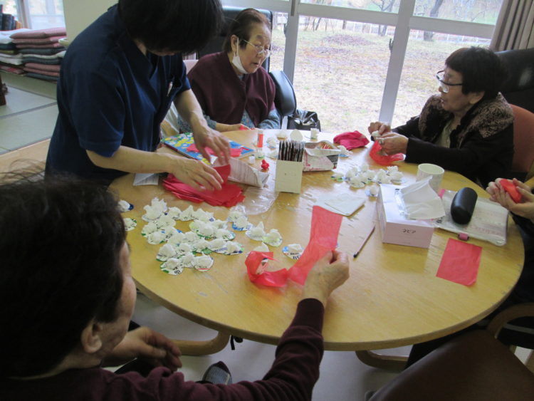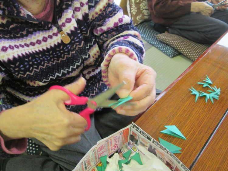 はい、本日の工作レクリエーションは、4月のカレンダー作りの続きです。これはカレンダーに貼るイチゴのヘタを利用者様に切っていただいております。