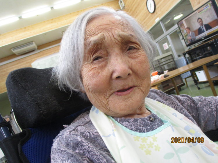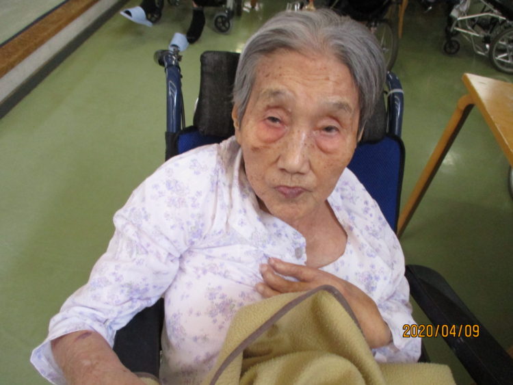 食後のM様です。今日は食後は少し眠そうにされていましたが、お声をかけると笑顔が見られ、カメラにサービスしていただけました。外は肌寒いですが、園内は時折日が差したりとポカポカしているので、食後の眠気は快適の証なのではないでしょうか。