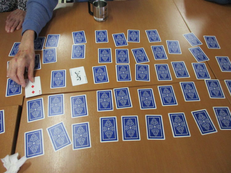 トランプをやりましょう。ババ抜きをやってみました。「昔は孫を膝の上に乗せてみんなでやったなー」と話す方もいました。良くある光景ですが今はやっているのですかね。
