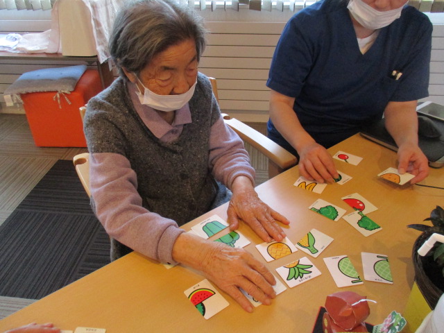 本日は昨日の宿泊時間の様子を御紹介致します。夕食後脳トレと致しまして、絵合わせを行いました。