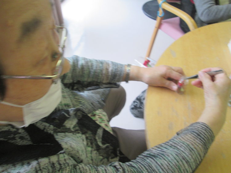さて、「花つながり」というわけでもないのですが、今日のレクリエーションはハーバリウム制作第2弾です。昨日制作されていない利用者様に数ある花の中からお好きなものを3種類選んで頂き、バランスよく小瓶に詰めた後・・・