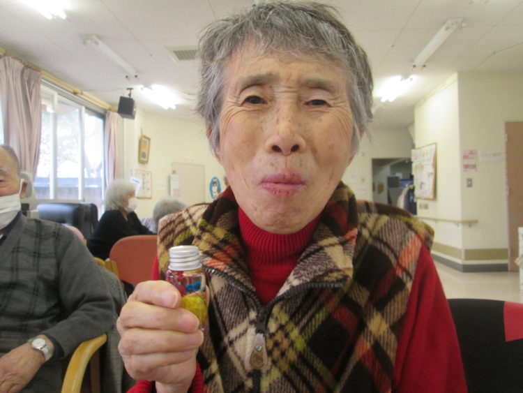 職員が専用のオイルを小瓶に注いだら完成です!ご覧下さい、この嬉しそうな笑顔を!花もオイルも100円ショップに売っておりますので、皆様も「ステイホーム」の空き時間に制作されてみてはいかがでしょうか。