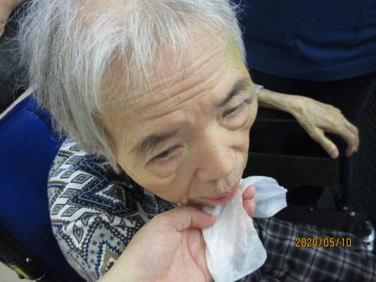 今日も毎日ご飯を食べ終わった後は嗽や歯磨きをしていってます。事あるごとに、利用者の一人が「これせねばまいんだか?」と聞かれ「そうですよ」と話すと「んだか」と納得します。たべこぼしや汚れが無い様に綺麗になって、健康な肌でいてください。