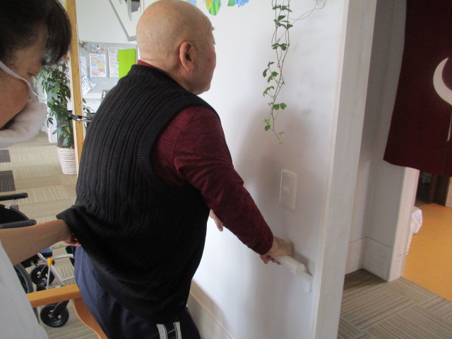 S様入浴後にホールにてT看護師付き添いにて立ち上がり訓練を行っている様子です。