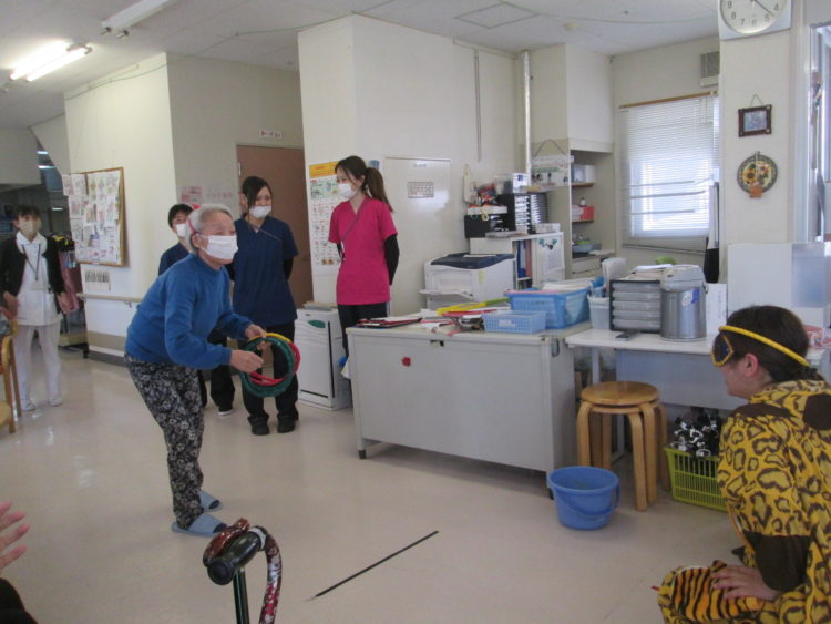 何と!!職員による余興が、本日一日限りで復活したのです!ヒゲダンスのテーマソングに合わせて水の入っているバケツを振り回したり、利用者様の投げた輪を職員が頭でキャッチしたり。めったに見られない余興とあって、皆、大盛り上がりでした。今日、誕生会にいらした方たちはラッキーでしたね。さあ、来月は・・・?