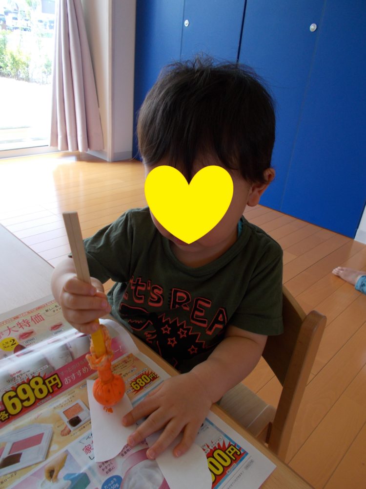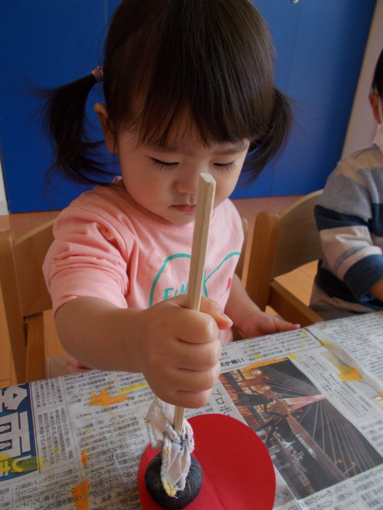様々な色に興味を持っている子ども達は、先生と一緒に絵の具の色を確認しながら絵の具遊びやスタンプ遊び等を楽しむ様子が見られました。