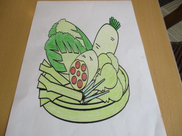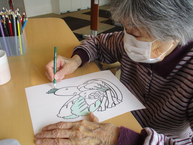 コーヒーを飲みながらホールにて野菜の塗り絵を行いました。