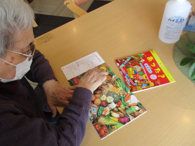 爪切りの後、「コレ何の本?」「課題の物を探していくんですよ。一緒にやってみましょうか」と声掛けし始めのうちは説明していましたが、「コレ楽しいね」と夢中になっておりました。