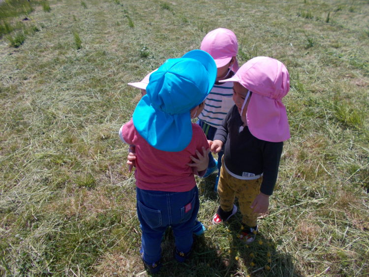 「まぶしいっ!」と顔を隠したり目をつぶったりしながらも、草の感触を楽しんでいた子ども達でした♪