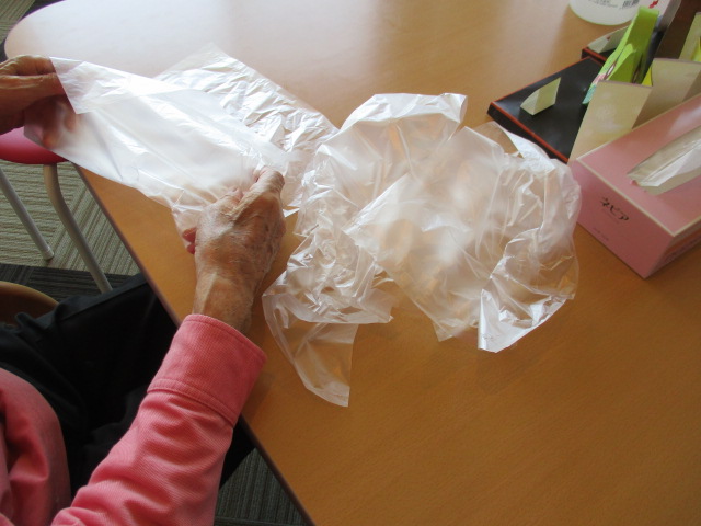 本日の小規模多機能ホームの様子を御紹介致します。午前M様に袋たたみをお手伝いして頂きました。本日はピンクのポロシャツで決まっているM様です。