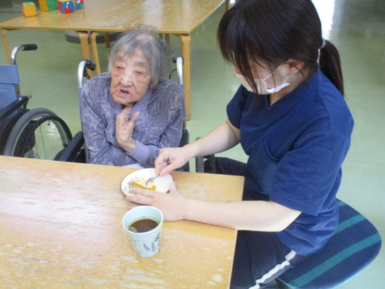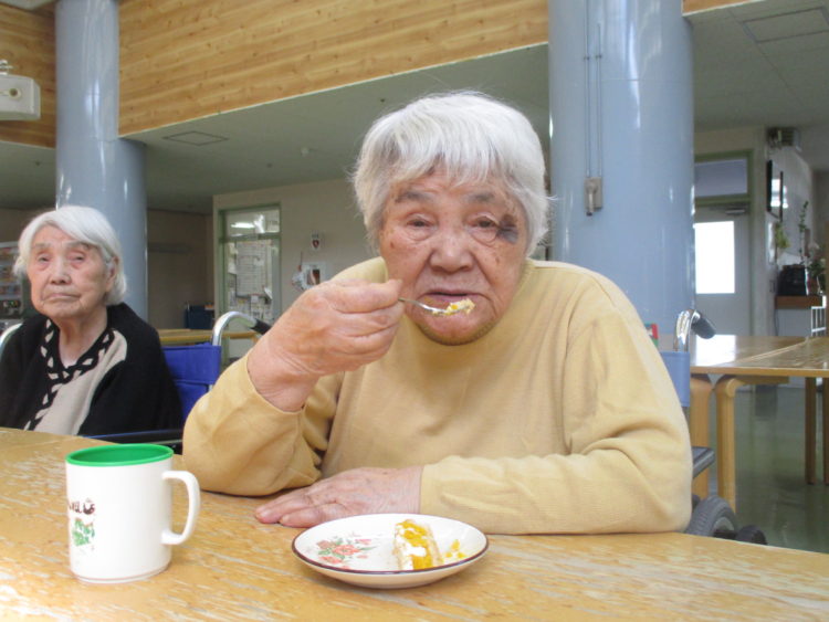 今回誕生会で出されたケーキはかぼちゃのタルトケーキでした!ケーキを美味しそうに頬張るK様!カメラ目線で「うめなぁ!」と話されていましたよ!