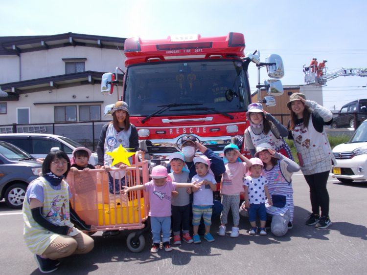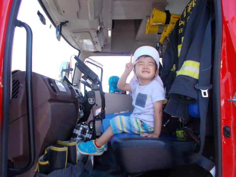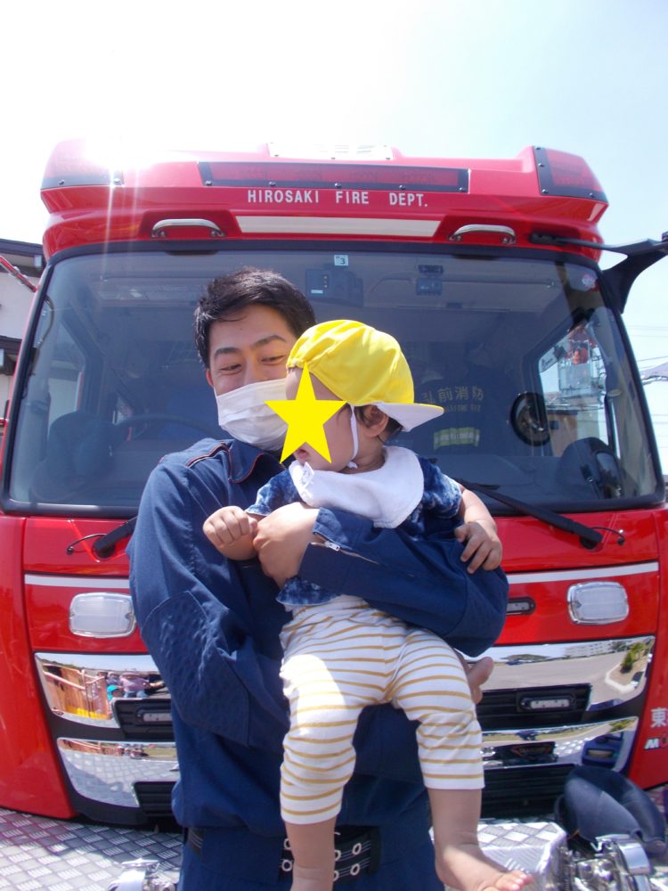 普段は人見知りのEくんもサービス精神旺盛な消防士さんの腕に抱かれ、ご満悦♪