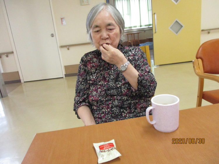 せんべい、クッキーのおやつを食べながらお茶会を楽しむ方