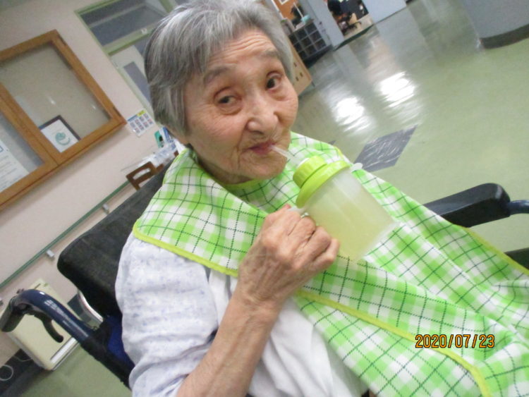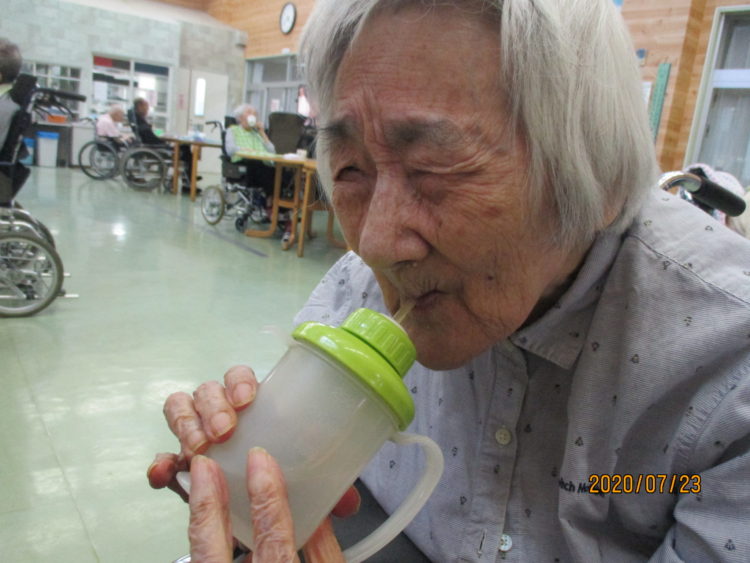 M様はお昼ごはんの後少しお部屋でお昼寝をしておられたので、少し眠そうな様子でした。水分を摂取されると大分目が覚めた様子で、ちゃんとごはんを召し上がる事が出来そうですね。