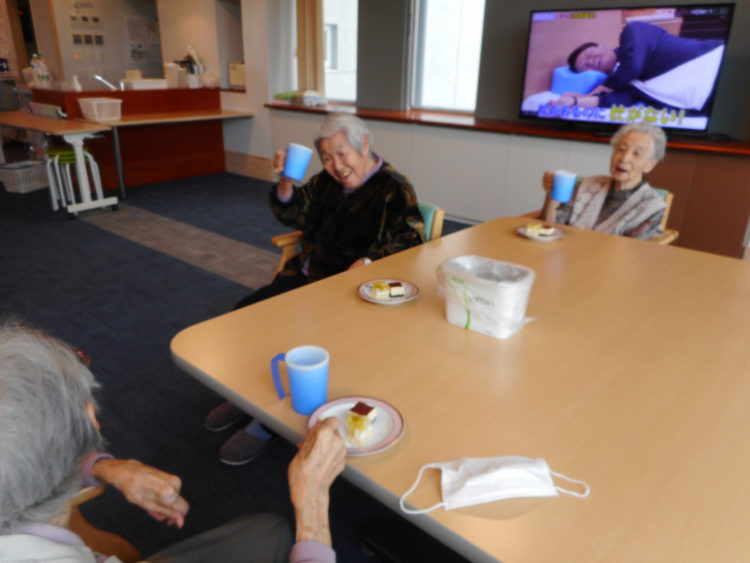 山崎ショートにて2階、3階合同で誕生会を開催しました。普段ケーキを摂取する機会が少ない為お客様は「わぁめぇそうなケーキだじゃ」等と話され、違うフロアのお客様同士、会話も弾み非常に有意義な時間を過して頂きました。じめじめとした日が続いていますがお客様、職員共々、体調管理に留意し小まめな水分補給を行い、熱中症対策をする必要があります。
