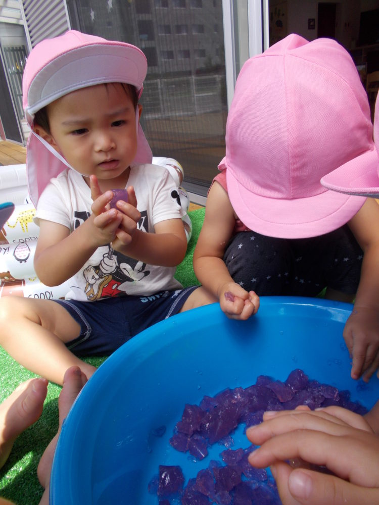 握ったり、つぶしたり…寒天の感触を楽しみながら遊んでいました^^
