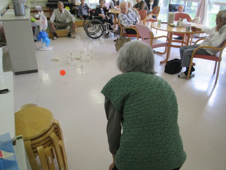 今日のレクリエーションは、ボーリングでした。久しぶりに参加される利用者様もいらっしゃって、「ん~。腕、鈍ってないといいんだけどな~。」と、自信なさげに挑戦されていましたが、どうしてどうして、パッカ~ン!と快音を響かせてピンを倒されていました。今日は、ゲームのルールを「一回でストライクを出したらプラス10点」「スペアでプラス5点」という事で始めたところ、みごとスペアを出された方がいらっしゃって、その方が本日の第一位と相成りました!笑い声が絶えない、楽しい時間でした。
