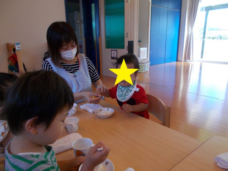 スプーンを下手持ちしたり、こぼさずに食べられるようになりました。じょうず!!
