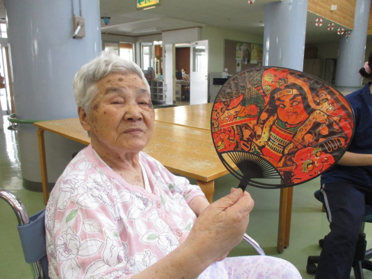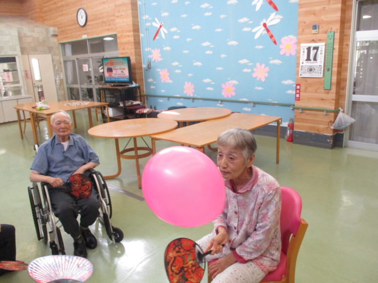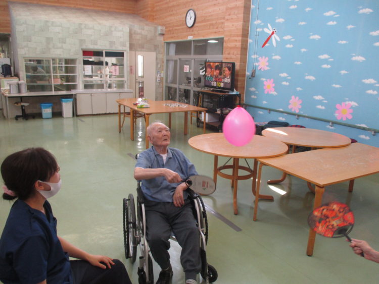 今日は風船バレーをやっております。K様は、うちわをこちらに見せ、やる気がみなぎっております!