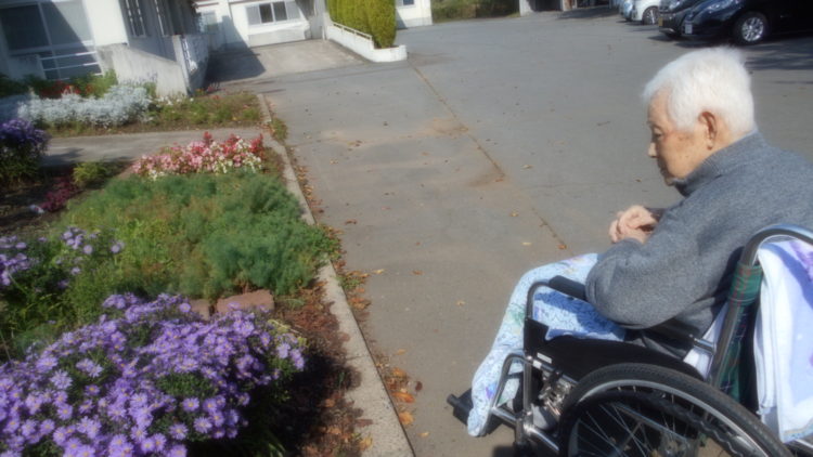本日はM様が昼寝をせずにホールにいらっしゃったため、散歩にお誘いしました。