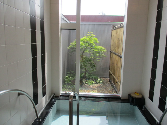 一般浴は小さな庭を眺めながら季節の移り変わりを感じゆったり寛いで頂けます。奥の湯口からお湯が注ぎ込まれるので熱いお風呂がお好みの方は奥にお入り頂いております。