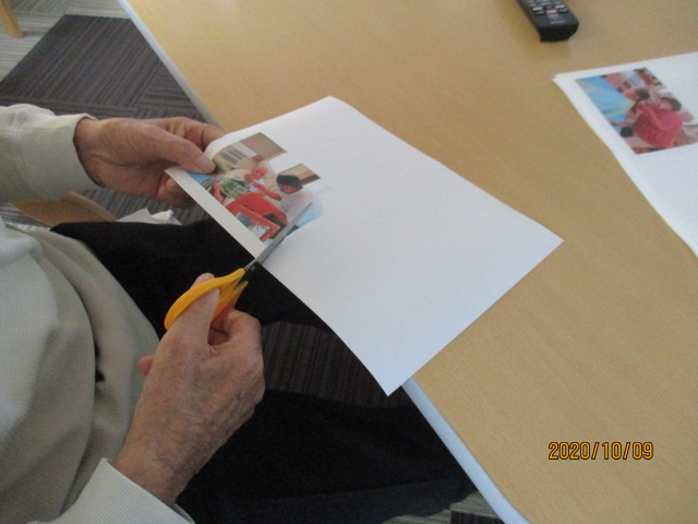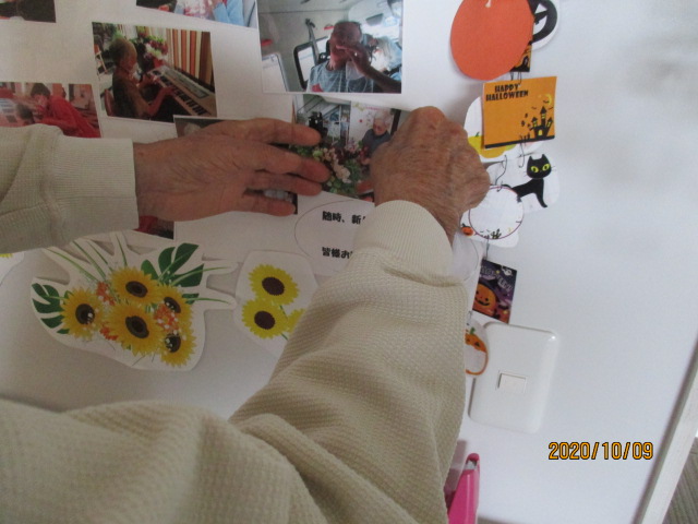 その後は職員と一緒に貼り、一番最後の写真の貼る場所に困っているとM様が「ここがいい」とアドバイスをくださいました。