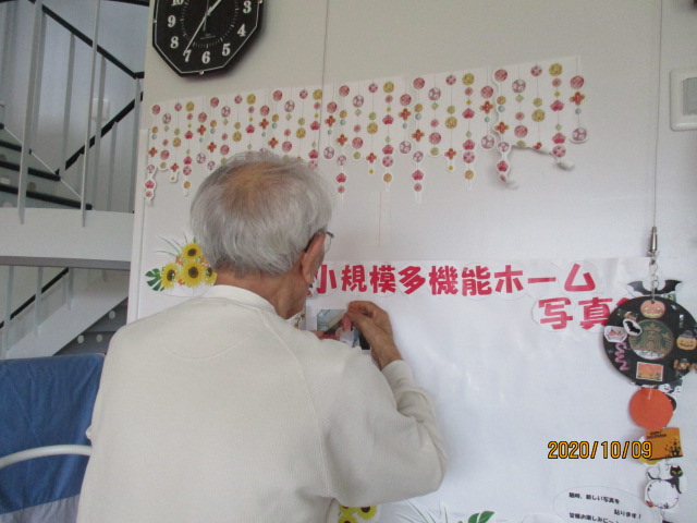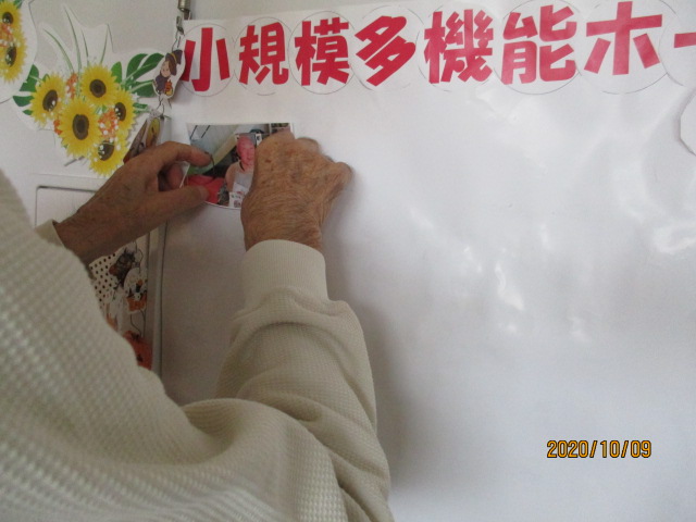 本日の小規模多機能ホームの様子をご紹介致します。本日はM様と一緒に小規模多機能ホーム写真館の写真を貼り替え致しました。M様は自分が写っている写真を見つけると、「これ私だ」と笑顔を見せて下さいました。