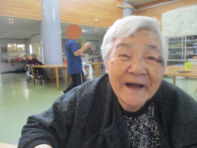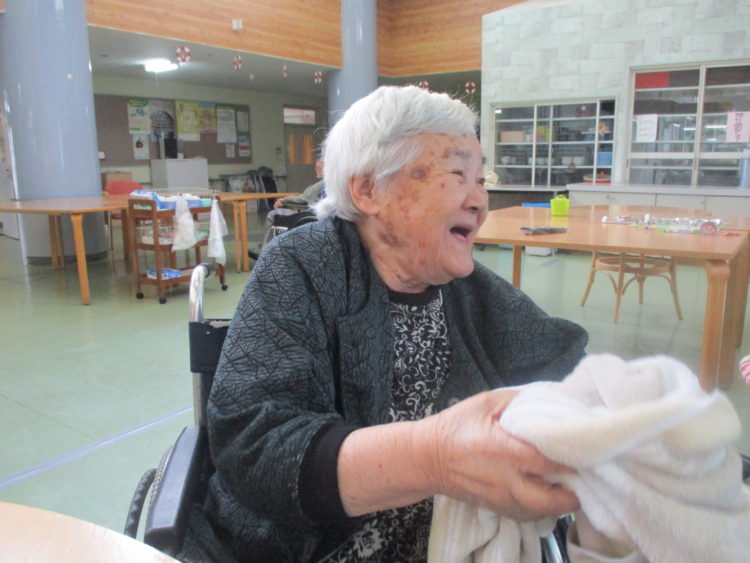 満面な笑みで「寒いから、着へ~」と膝掛けを職員に掛けようとしています。