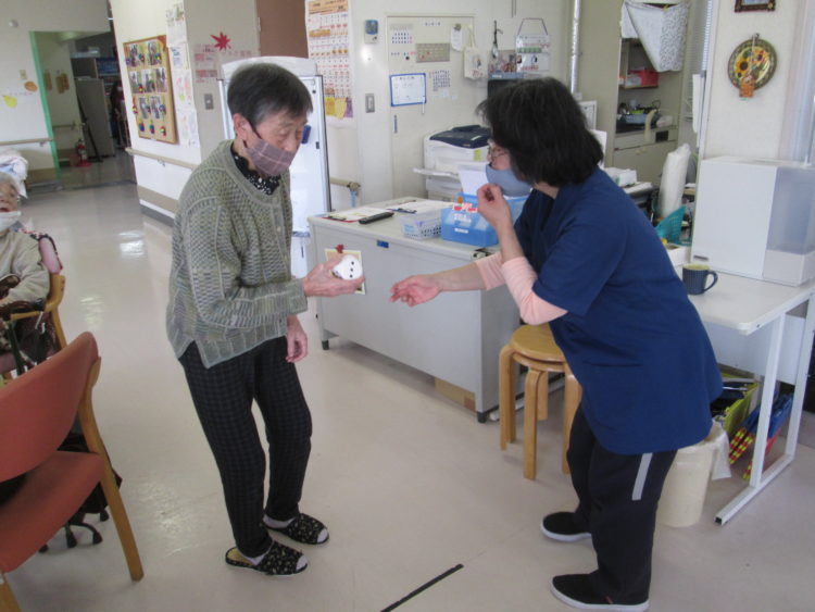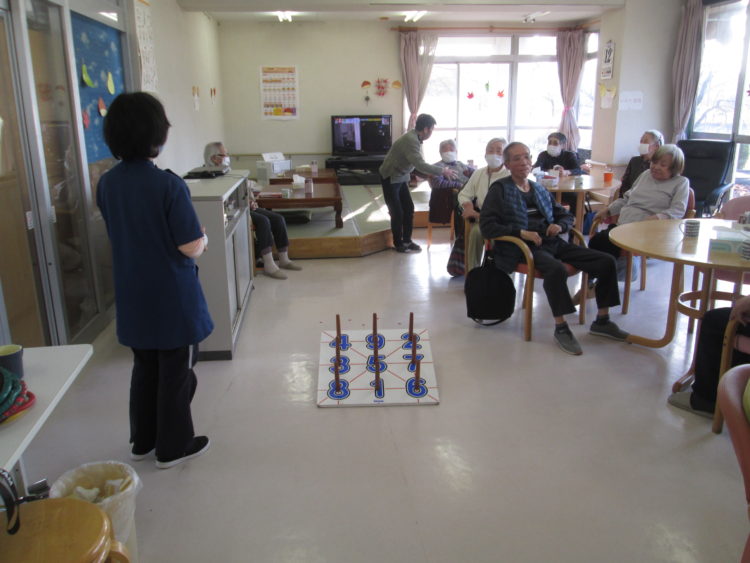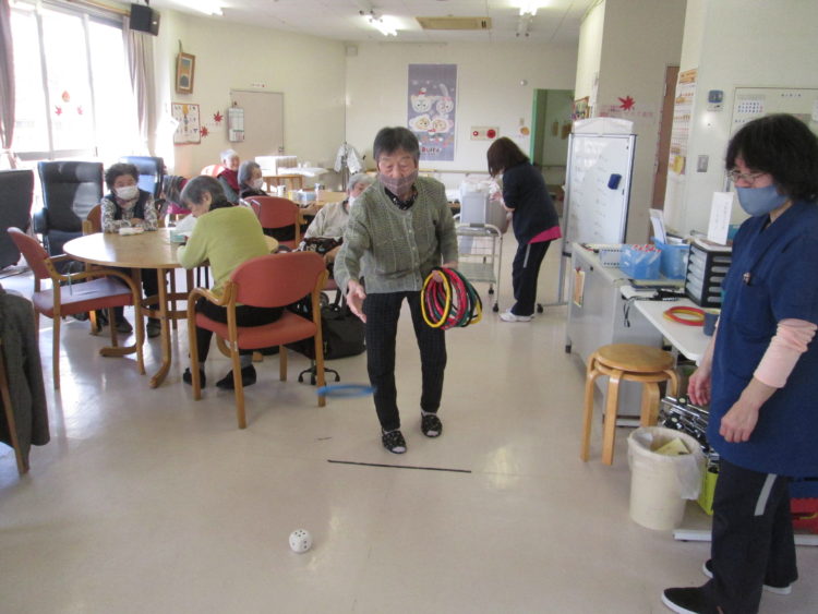 今日のレクリエーションは、輪投げです。・・・が、ただ行うのでは面白くないので、きょうのルールはサイコロを一人2回振ってもらって、その合計数の輪を投げて頂く事にしました。そのほかは、いつも通り縦・横・斜めにビンゴがでたらプラス10点です。