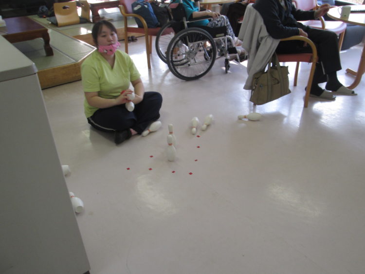 今日のデイサービスの昼食は三食丼です。とても美味しそうにみえ、また実際は味良し・みためよし・のいうことなしの行事食です。行事食を食べたあとは、みんなで楽しくボーリング大会です。