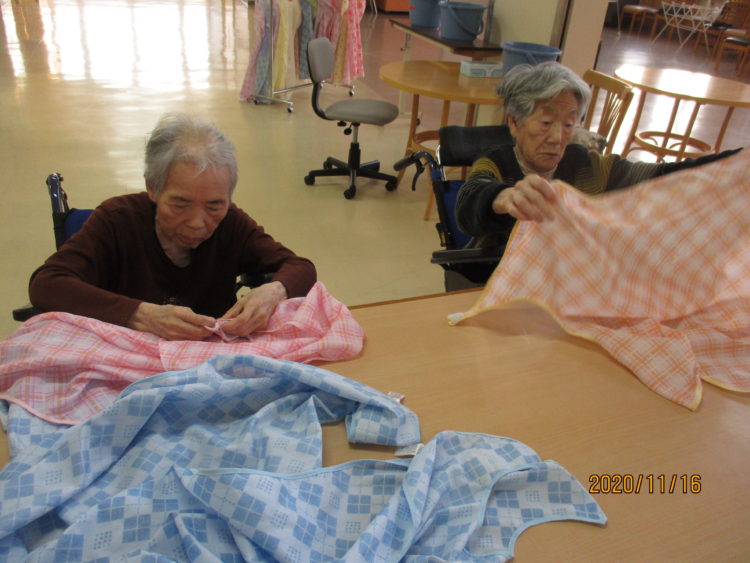 こちらは夕食時に使うエプロンを畳んで下さっているY様とT様。