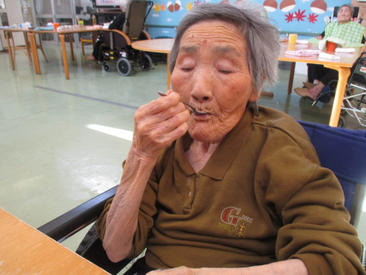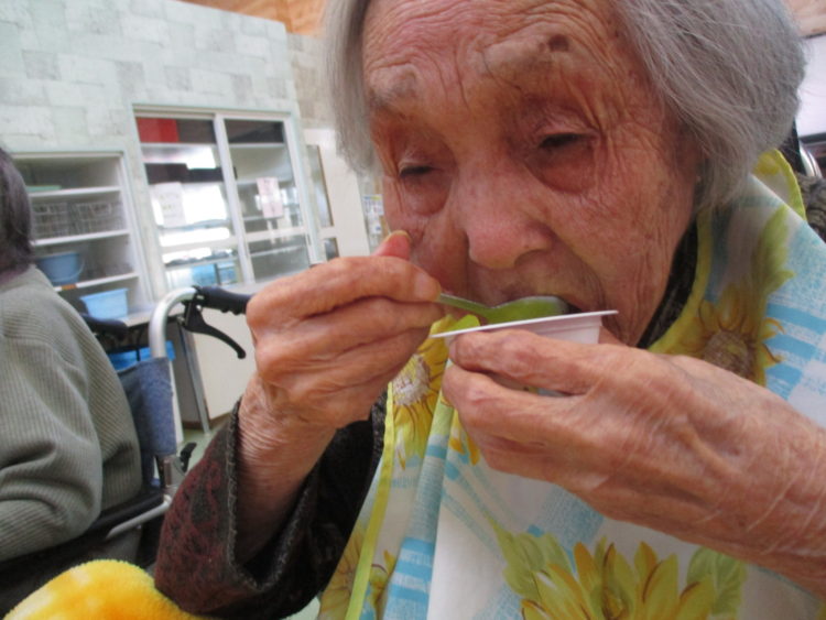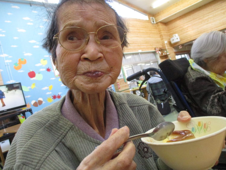 M様はゼリーをパクリ!美味しいですか?とたずねると、ピースで答えていただけました(^V^)