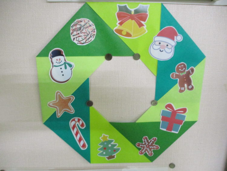12月といえばもうすぐクリスマスということで、職員が作成した折り紙のリースが飾っており、華やかな様子です。毎年お客様には色々プレゼントをさせて頂いておりました。