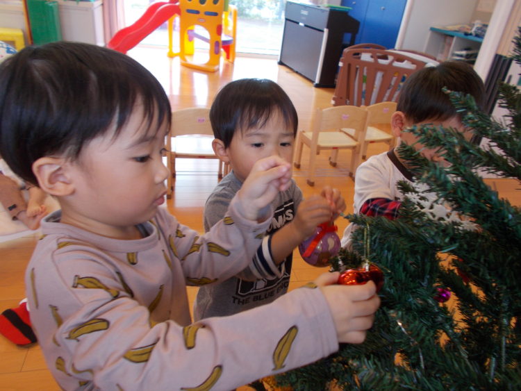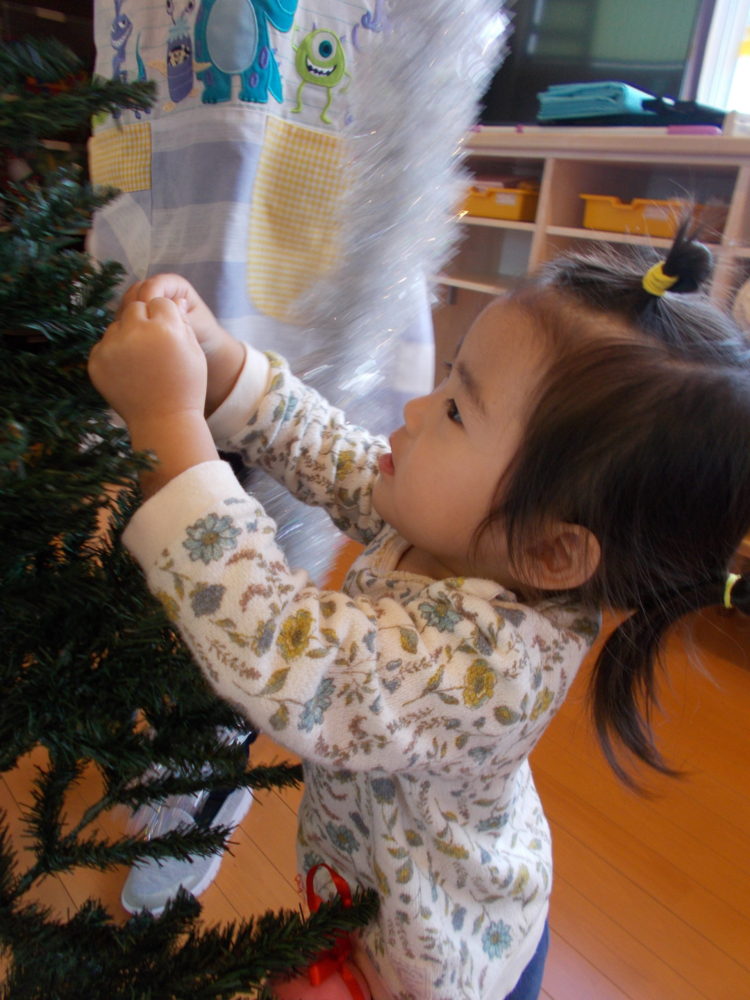 昨日保育園ではみんなでクリスマスツリーの飾りつけをしました!!