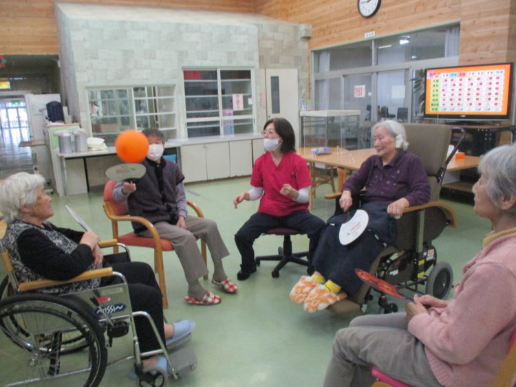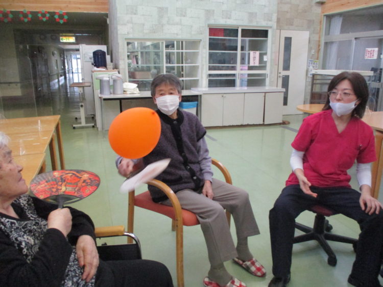 午後には、機能訓練士とほかのお客様と風船バレーをして、楽しんでおりました。