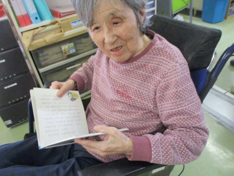 「何か見るものないか」と話されていたので、本を手渡すとじっくりと読んでいました。普段は居室のベッドで過ごすことが多いのですが、この後もしばらく起きて過ごし、色々な表情を見せてくださいました♪