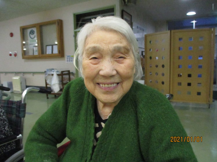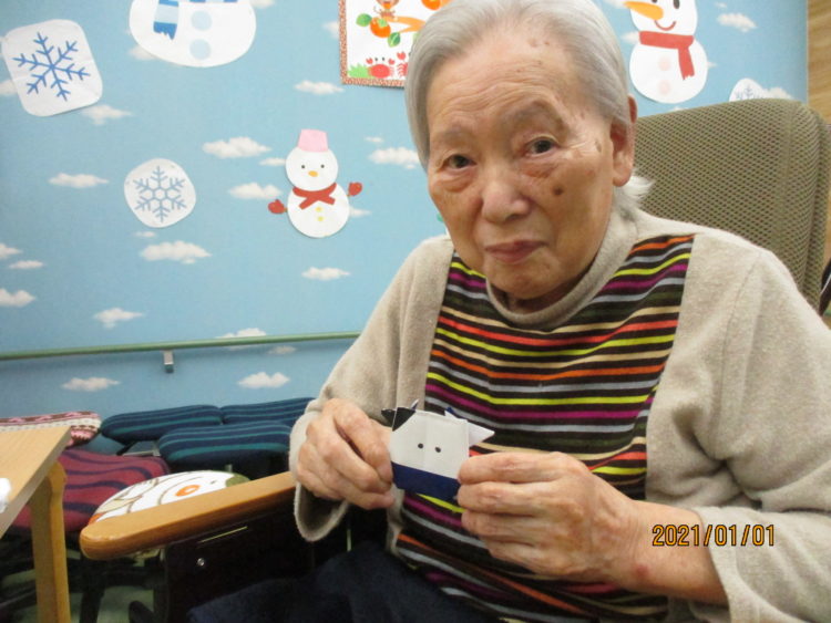 Y様は職員からもらった今年の干支である牛の折り紙を手にしながら、新年のご挨拶。私達も今年も宜しくお願いします。