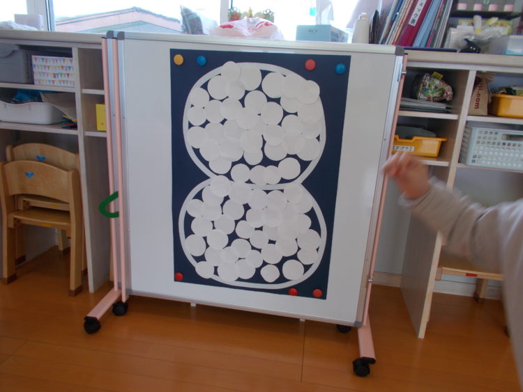 園内のあちこちに隠してある雪玉を探し、みんなで集めて貼っていくと・・・