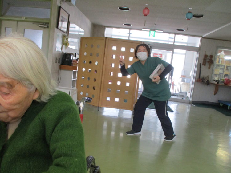 リンゴを切り分けてくれたS主任です。カメラを向けたらしっかりポーズを決めてくれました(笑)切ってくれて、ありがとうございました!