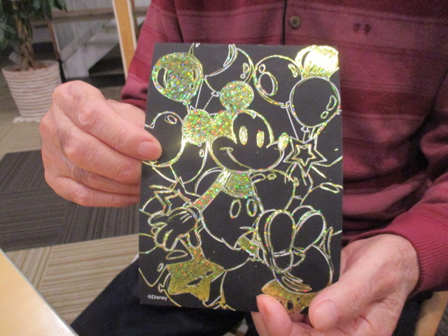 本日はお客様の作品作りの様子をお伝え致します。これまで押し花、タイル細工、デコパージュ等々、様々な作品作りをして頂き展示して参りましたが、今回は白線を専用のペンで削るだけの「スクラッチアート」を100円ショップで見つけて来ました。