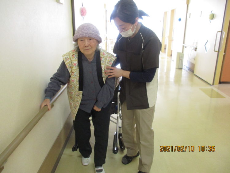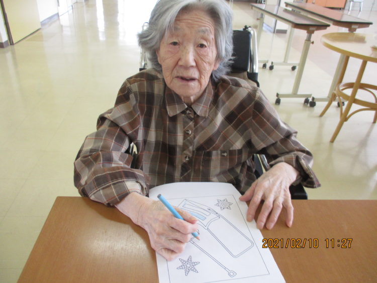 塗り絵を頑張っているM氏と技能訓練そ職員を一緒に歩行訓練を頑張っているS氏です。M氏は、「どんだべ。上手だが」と職員に話しかけながら一生懸命にとりかかっていました。またS氏は「早く一人で歩きたいな」と必死に頑張っていました。